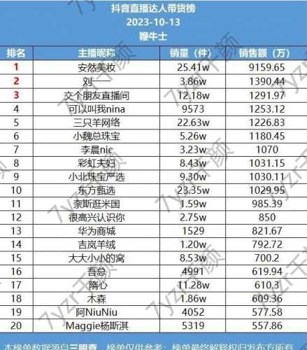 10月13日,抖音和快手平臺(tái)的直播帶貨榜單上出現(xiàn)了一些有趣的數(shù)據(jù)。