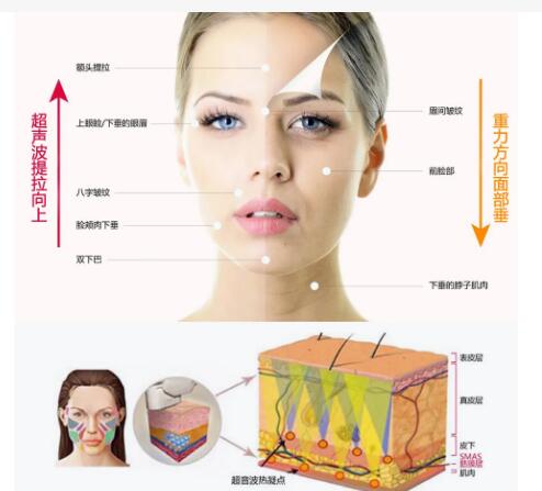 2.采用聚焦超聲能量,調(diào)節(jié)溫度可達(dá)65~70攝氏度,刺激大量膠原蛋白再生重組。