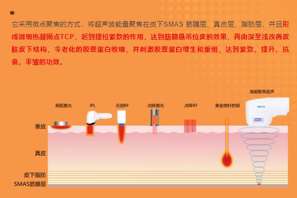 超聲炮是國產(chǎn)半島設(shè)備,這家公司設(shè)備和原來那個(gè)美版超聲提拉一樣,是那種聚焦超聲提拉 ,定點(diǎn)技術(shù),能在你這個(gè)皮膚不同層次貨源優(yōu)質(zhì)或者是更深的筋膜層,給你進(jìn)行一種熱刺激,就是抗衰,主要針對(duì)就是軟組織下垂這些問題,所以它比較適合我們?nèi)饽樆蛘呤擒浗M織比較飽滿的姐妹
