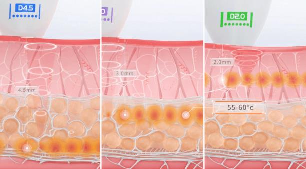 它有兩種調(diào)節(jié)頭,4.5和3.0刀頭,2.0,3.0和4.5的超聲炮刀頭,是定點(diǎn)操作,類似于原先的那個(gè)美版超聲提拉,把熱量都都給你都懟進(jìn)去,那個(gè)超聲炮頭滑動(dòng)的打法,是慢慢的把這些區(qū)域給你加熱量。剛剛那個(gè)什么幾點(diǎn)零那些數(shù)字 ,就是說你打擊不同的深度,