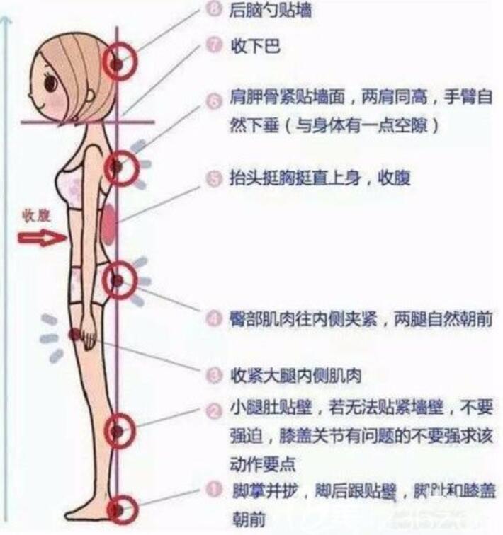 標(biāo)準(zhǔn)姿勢(shì):頭后貼墻;合下巴;肩胛骨貼墻,與肩同高,手臂自然下垂(與身體有少許間隙);上身伸直,頭直胸直,腹部收緊;將臀部肌肉夾在內(nèi)側(cè),雙腿自然向前移動(dòng);收緊大腿內(nèi)側(cè)肌肉;將小腿腹部貼在墻上,如果貼不住墻,不要用力,如果膝關(guān)節(jié)有問題,不要用力移動(dòng)的關(guān)鍵點(diǎn);腳底貼緊,腳跟靠墻,腳趾和膝蓋向前。